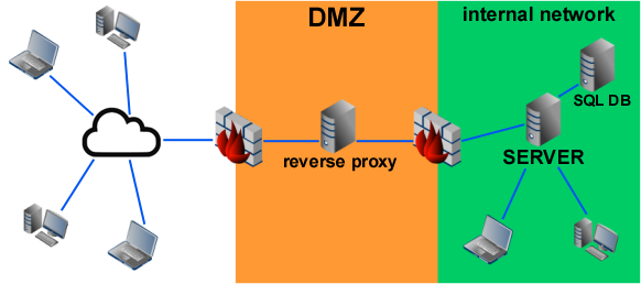 Работа сервера за ДМЗ![]() Для работы удаленных сотрудников не всегда безопасно открывать порты сервера в Интернет из-за сетевых атак. Как вариант решения проблемы можно использовать reverse-proxy в "демилитаризованной зоне" (ДМЗ). Прокси будет перенаправлять TCP-трафик от удаленных клиентов к серверу в интрасеть. Таким образом, при массированных сетевых атаках сервер комплекса будет менее уязвим. В качестве прокси-сервера можно использовать nginx в режиме reverse-proxy (ngx_stream_proxy_module). Ниже приведен пример настроек nginx для проксирования с внешнего порта 12345 на внутренний сервера server:22222