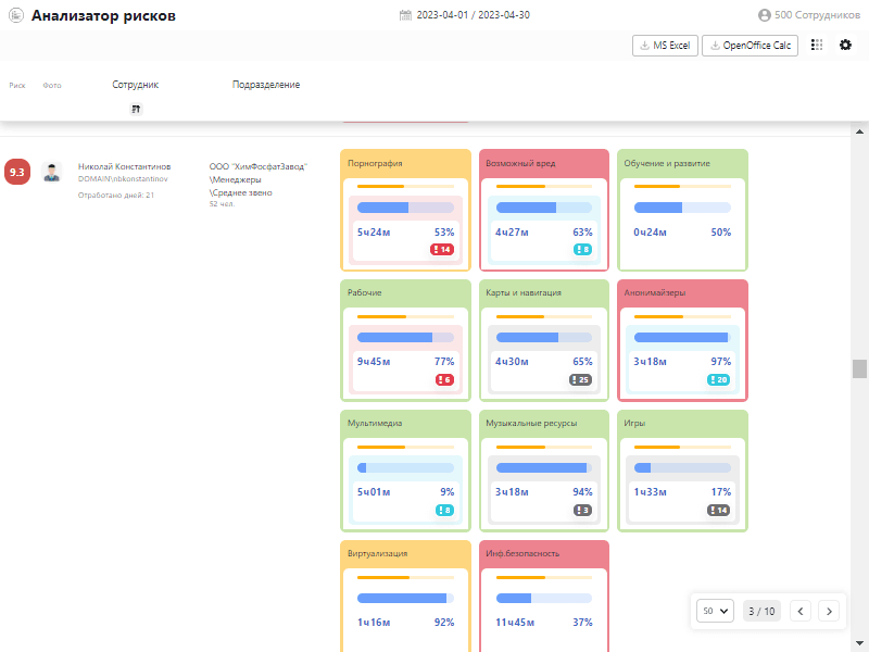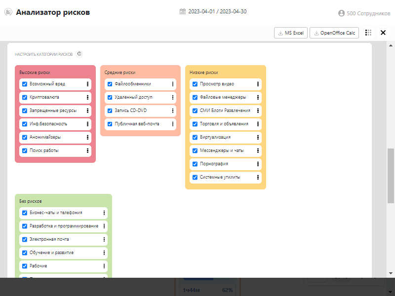 • временем, проведенным сотрудником на ресурсах (веб-сайты и приложения) из группы риска;
