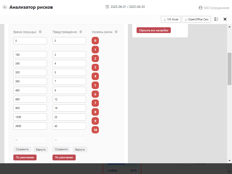 Общий уровень риска сотрудника выражается в баллах и варьируется в диапазоне от 0 (наименьшее значение, отсутствие риска) до 10 (наибольшее значение, максимальный риск). Уровень риска высчитывается за определенный пользователем временной промежуток. Временной промежуток задается при генерации отчета.