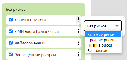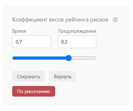 Коэффициент весов рейтинга рисков определяет, насколько тот или иной параметр пропорционально влияет на расчет рисков: время, проведенное пользователем в ресурсах словарей или совпадения с заданными словами словарей (предупреждения). При этом в сумме веса равны единице.