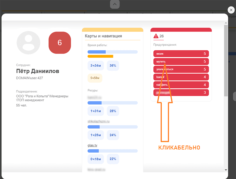 По любой из категорий словаря можно кликнуть мышью и узнать подробности активности сотрудника, то есть детализировать значения, по которым информация классифицировалась.