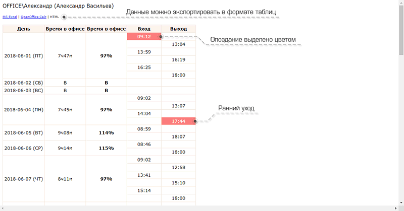 Опоздания и ранние уходы выделяются цветом. Внимание! Для отображения данных из СКУД, необходимо настроить их синхронизацию, например, при помощи специальной утилиты |