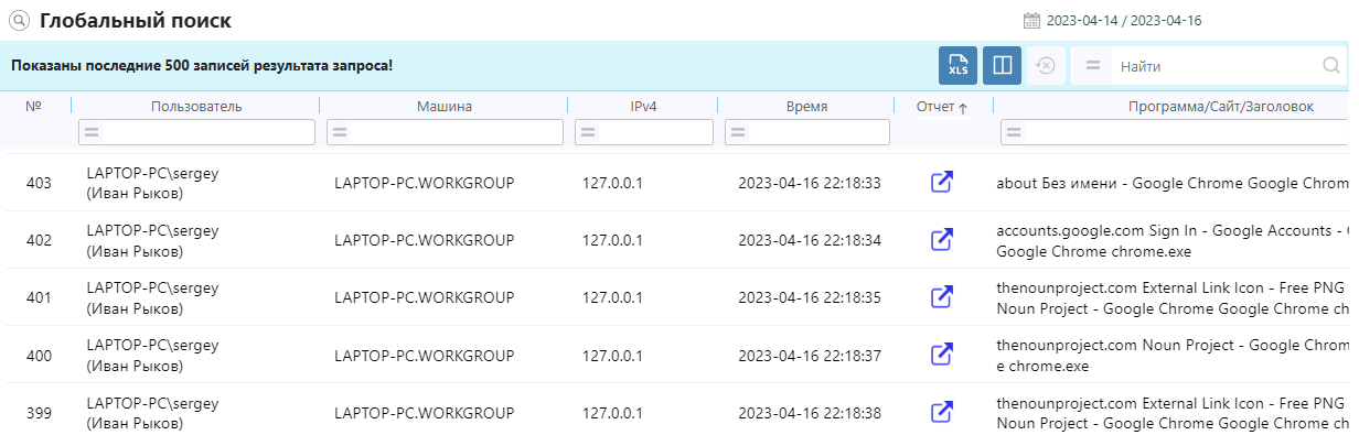 - домен+логин сотрудника, опционально его ФИО; - ПК сотрудника и его IP; - время события с возможностью перейти на ближайший скриншот в отчете "Снимки экранов"; - домен посещенного сайта, заголовок окна приложения, описание приложения, исполняемый файл приложения; - текст кейлоггера или текст буфера обмена. Внимание! Данные результата отсортированы по времени событий (сначала самые последние) и показывается не более N-результатов (обычно 500). |