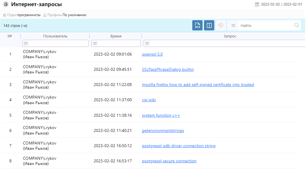 Интернет-запросыОтчет отображает информацию о поисковых интернет запросах пользователя.Указывается дата, время запроса и сам запрос. Информация представлена в виде активной ссылки, ее можно открыть в браузере.
