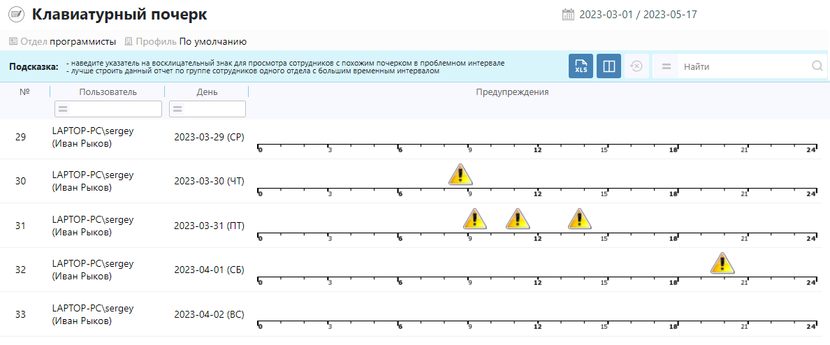 такого рода собирается в течение нескольких дней по каждому пользователю. Предупреждения — это восклицательный знак в отчете. Если отчёт пуст, значит в выбранном временном периоде событий нет Внимание! Отчет выдает информацию после некоторого времени сбора информации, в среднем - около месяца. Срок зависит от количества вводимого текста сотрудником: для кого-то идентификация проходит быстрее, для кого-то медленнее. Внимание! Для отображения данной информации необходимо чтобы была включена опция |