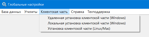 Клиентская частьПосле установки серверных компонент часто возникает потребность в быстром доступе к локальной или удаленной установке клиентской части комплекса.Удобнее всего воспользоваться главным меню в программе Глобальных настроек (доступна в меню "Пуск" и на "рабочем столе"): ![]() |