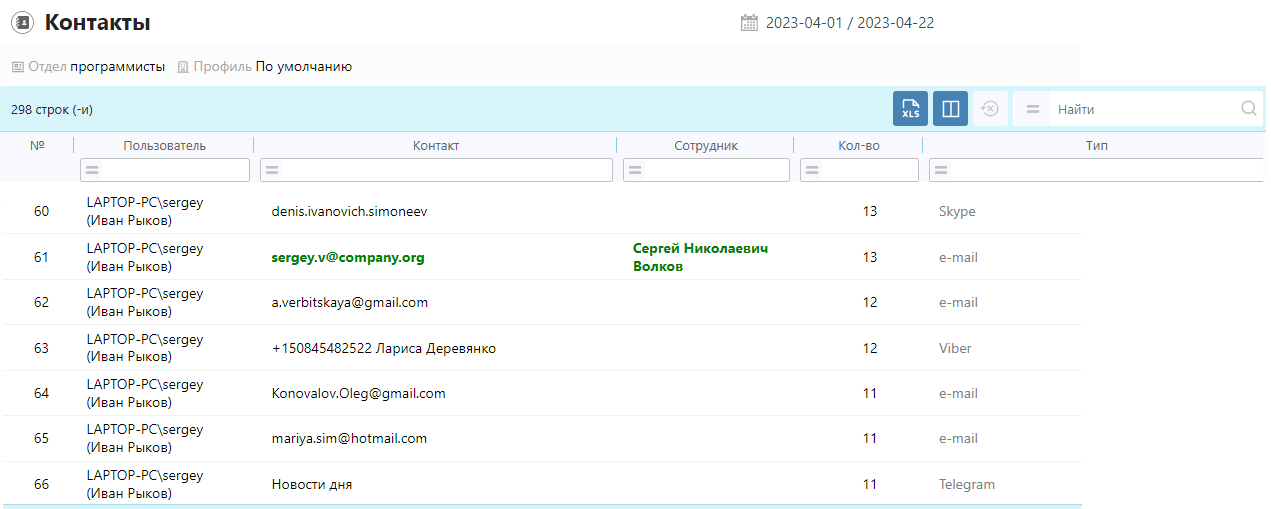 КонтактыОтчет "Контакты" формируется на основании информации полученной из отчетов "Письма (e-mail)" и "Чаты/звонки". Наглядно демонстрирует количество и тип контактов выбранного пользователя за указанный промежуток времени с конкретным адресатом.