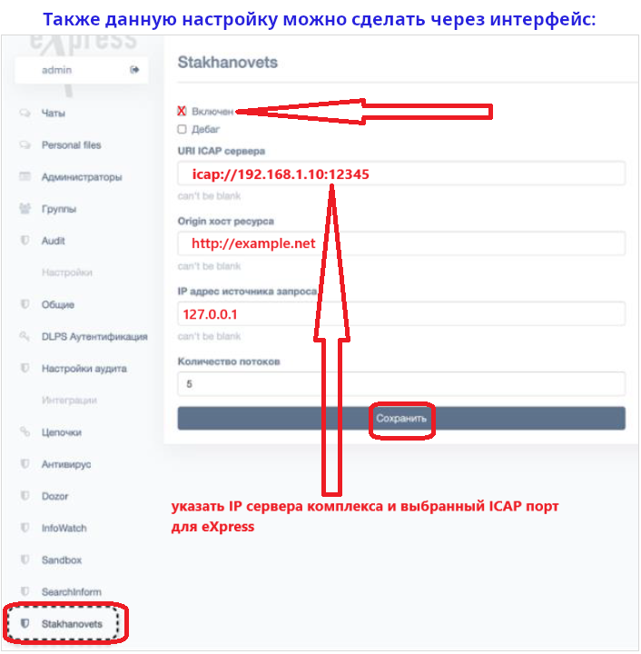 Мониторинг - Чаты-звонкиICAP TCP-порт для входящих соединений eXpress DLPSЕсли у вас используется корпоративная версия мессенджера eXpress, то можно настроить интеграцию с его модулем DLPS, который будет передавать серверу комплекса всю переписку (входящие и исходящие сообщения) для дальнейшего отображения их в отчете "Чаты/звонки". В качестве TCP-порта нужно установить уникальный номер, который не будет пересекаться с номером порта сервера комплекса и каким-либо другим, данный порт будет открываться сервером комплекса для приема входящих соединений от мессенджера (Firewall не должен блокировать этот порт!) Если номер порта указан 0, то интеграция не используется! Внимание! Если изменялся номер порта в настройках с ненулевого значения на любое другое, то необходим перезапуск службы сервера комплекса для вступления новых настроек в силу! Внимание! Сопоставление сотрудников из мессенджера с сотрудниками из базы данных комплекса происходит по корпоративным e-mail сотрудников, которые должны быть установлены для пользователей мессенджера. В противном случае интеграция не будет возможна! Например, если e-mail сотрудника в мессенджере установлен как ivanov@company.org, то будет попытка поиска данного сотрудника сначала как COMPANY\ivanov в базе комплекса, а потом в "Досье" по e-mail. Перед настройкой eXpress нужно убедиться что модуль DLPS установлен и включен (также можно обратиться к корпоративной консоли eXpress по веб-адресу: /dlps/). Далее необходимо сделать настройки через системную терминальную консоль на сервере eXpress: cd /opt/express/ dpl --dc exec dlps ./bin/dlps remote_consoleДалее в открывшейся консоли настроек ввести команды. Включение модуля: DLPS.Etcd.proto_enabled_put(true)Установить связь с сервером комплекса (вместо IP:порт нужно указать IP/имя сервера комплекса и через двоеточие номер порта, установленного на этой странице настроек):