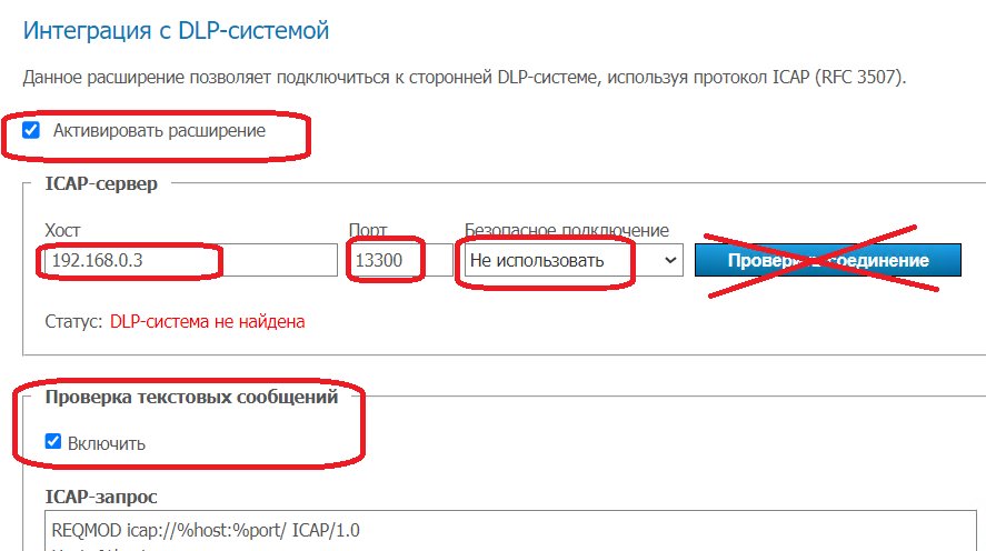 ICAP TCP-порт для входящих соединений TrueConf Если ваша лицензия TrueConf позволяет включить интеграцию с DLP, то это можно сделать в настройках TrueConf (раздел "Интеграция с DLP"). Мессенджер будет передавать серверу комплекса всю переписку (входящие и исходящие сообщения) для дальнейшего отображения их в отчете "Чаты/звонки". В качестве TCP-порта нужно установить уникальный номер, который не будет пересекаться с номером порта сервера комплекса и каким-либо другим, данный порт будет открываться сервером комплекса для приема входящих соединений от мессенджера (Firewall не должен блокировать этот порт!) Если номер порта указан 0, то интеграция не используется! Внимание! Если изменялся номер порта в настройках с ненулевого значения на любое другое, то необходим перезапуск службы сервера комплекса для вступления новых настроек в силу! Внимание! Сопоставление сотрудников из мессенджера с сотрудниками из базы данных комплекса происходит по корпоративным e-mail сотрудников, которые должны быть установлены для пользователей мессенджера. В противном случае интеграция не будет возможна! Например, если e-mail сотрудника в мессенджере установлен как ivanov@company.org, то будет попытка поиска данного сотрудника сначала как COMPANY\ivanov в базе комплекса, а потом в "Досье" по e-mail. Пример настройки для сервера комплекса с IP 192.168.0.3 и установленным портом ICAP 13300: