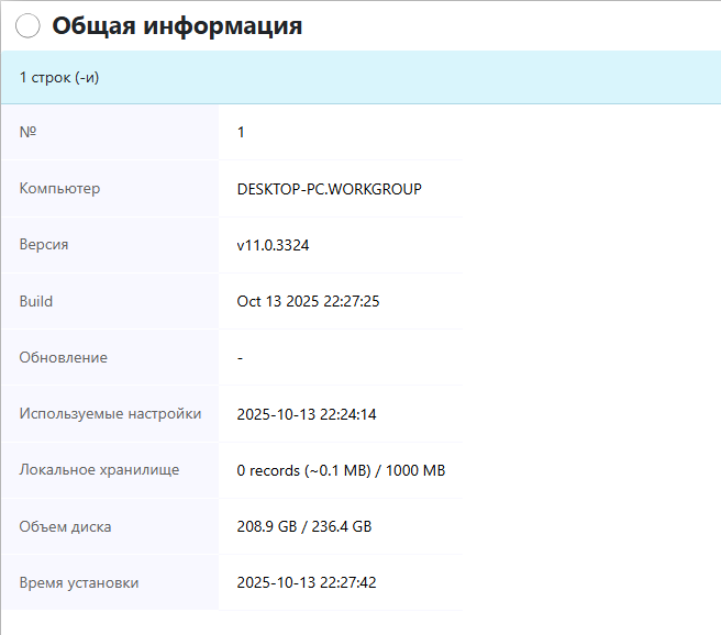 Общие сведенияВ правой части экрана расположены кнопки управления.![]() Действие кнопок распространяется на отмеченных пользователей. Возможно массовое указание пользователей, отмечая их при зажатой клавише Ctrl. Так же можно отмечать указанные вами структурные единицы и тогда действие кнопки будет распространяться на всех пользователей данной структурной единицы. Отображение возможно для группы пользователей. Общие сведения представлены таблицей со следующими данными: Поле "Машина или машина/пользователь" отражает за каким компьютером находится пользователь. Поле "Версия клиента" отображает версию установленного клиента. Поле "Build" отображает дату выпуска установленной версии клиента. Поле "Обновление" отображает требуется ли или обновление уже получено и нужна перезагрузка. Поле "Используемые настройки" отображает последние примененные настройки. Если Вы только что внесли изменения, касающиеся пользователей, в глобальных настройках, то в данном поле можно увидеть принял ли клиент сделанные вами настройки. В поле "Локальное хранилище" отображается размер данных собранных с клиента и ещё не переданных на сервер. Большой объем данных показывает, что данные с клиента давно не передавались на сервер. В поле "Объем диска" показан занятый и общий объем системного диска (обычно C:). В поле "Время установки" - дата и время первой установки клиентской части на данный ПК. ![]() |