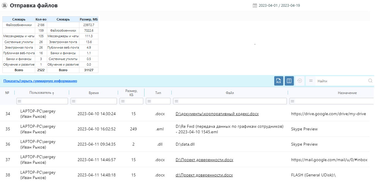 Отправка файловВ отчёте отражаются файлы, отправленные через сайты-файлообменники, вложения к письмам через почтовые сайты и почтовые программы, записанные на Flash-диск, отправленные через популярные мессенджеры.