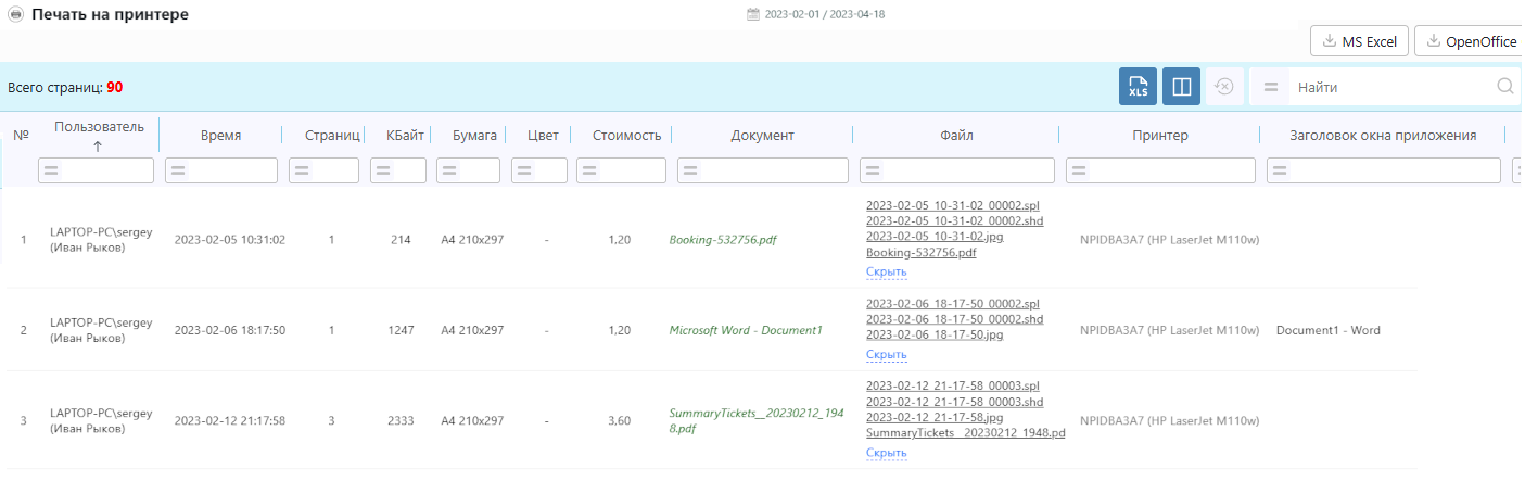 Отчёт показывает файлы, отправленные на печать выбранными пользователями, статистику печати за указанный период времени.