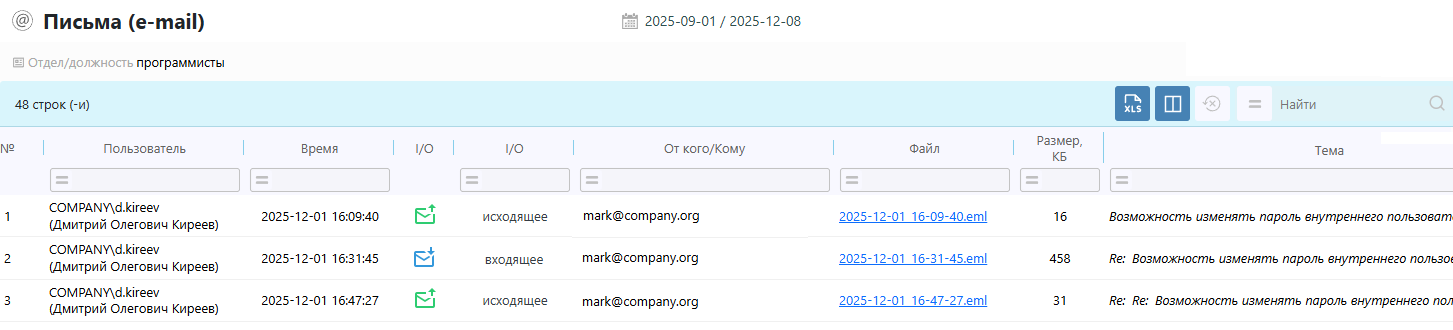 Письма (e-mail)В отчете "Письма (e-mail)" отображаются письма, отправленные и полученные выбранными сотрудниками за указанный период. Поддержка перехвата описана на странице:Глобальные настройки - Настройки комплекса - Для пользователей – Почта.