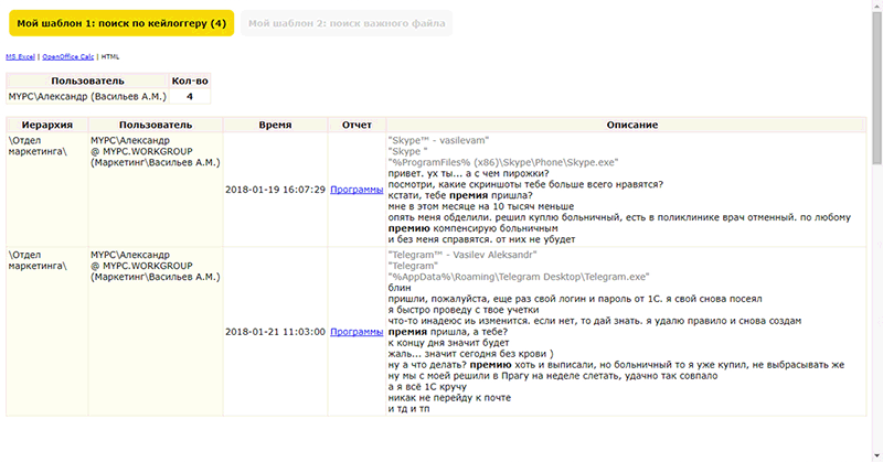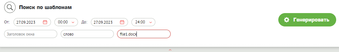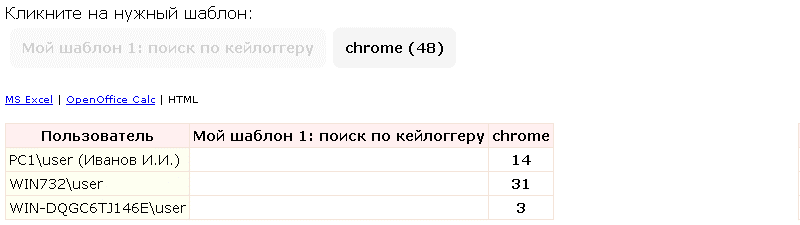 Поиск по шаблонамОтчет позволяет на основе созданных шаблонов поиска произвести сквозной поиск данных в перехваченной по пользователю информации.Опции и шаблоны отчета настраиваются в Глобальных настройках – Шаблоны отчетов Слева выбираем пользователей, справа - отчет, по центру задаем период для поиска информации. Если созданы динамические шаблоны, то вводим значения для поиска и нажимаем кнопку "Генерировать".