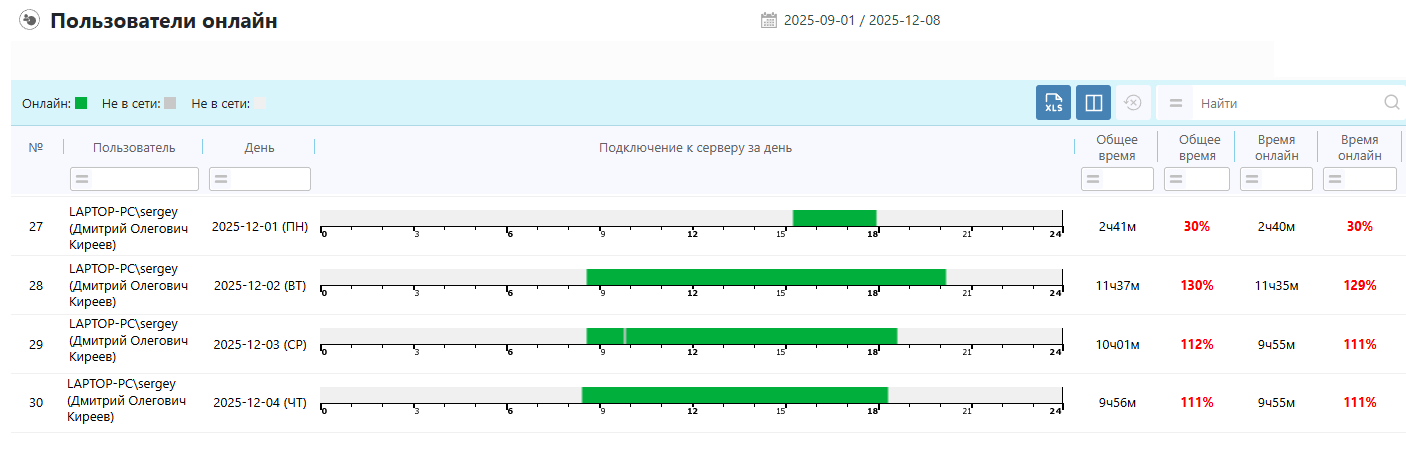 Пользователи онлайнДанный отчет полностью аналогичен по структуре отчету "Пользовательское время", однако зеленым цветом в нем показаны промежутки времени, когда пользователь был онлайн (т.е. подключен к серверу).