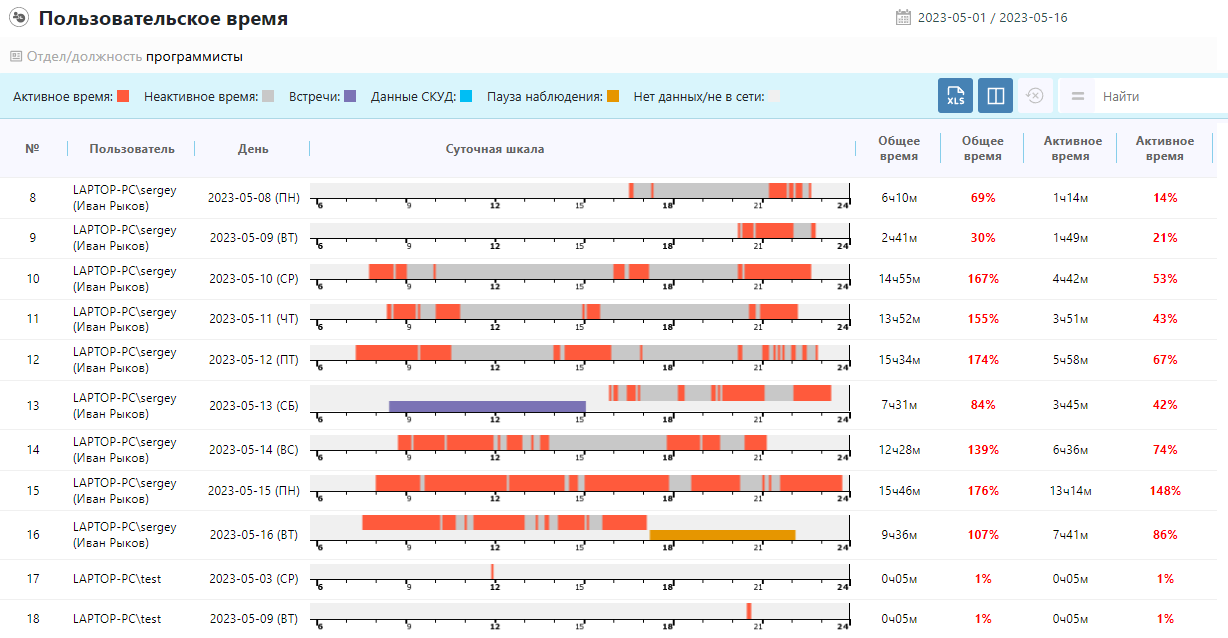 Для наглядности по каждому дню имеется графическое отображение активности пользователя на временной шкале. Если сотрудник использует MS Outlook, то раз в 5 мин происходит синхронизация встреч из календаря. Причем, важно отметить, что прошлые встречи в БД не попадают. Учитываются только встречи, которые состоятся после момента синхронизации.