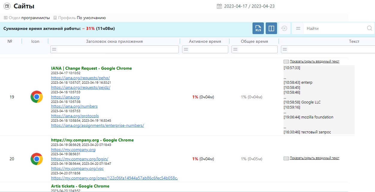 Отчет предоставляет информацию о сайтах, которые пользователь посещал. Все посещения сгруппированы по доменам. Посещения сайтов расположены в порядке убывания по активному времени: первым в списке расположен ресурс, где пользователем проведено наибольшее количество активного времени.