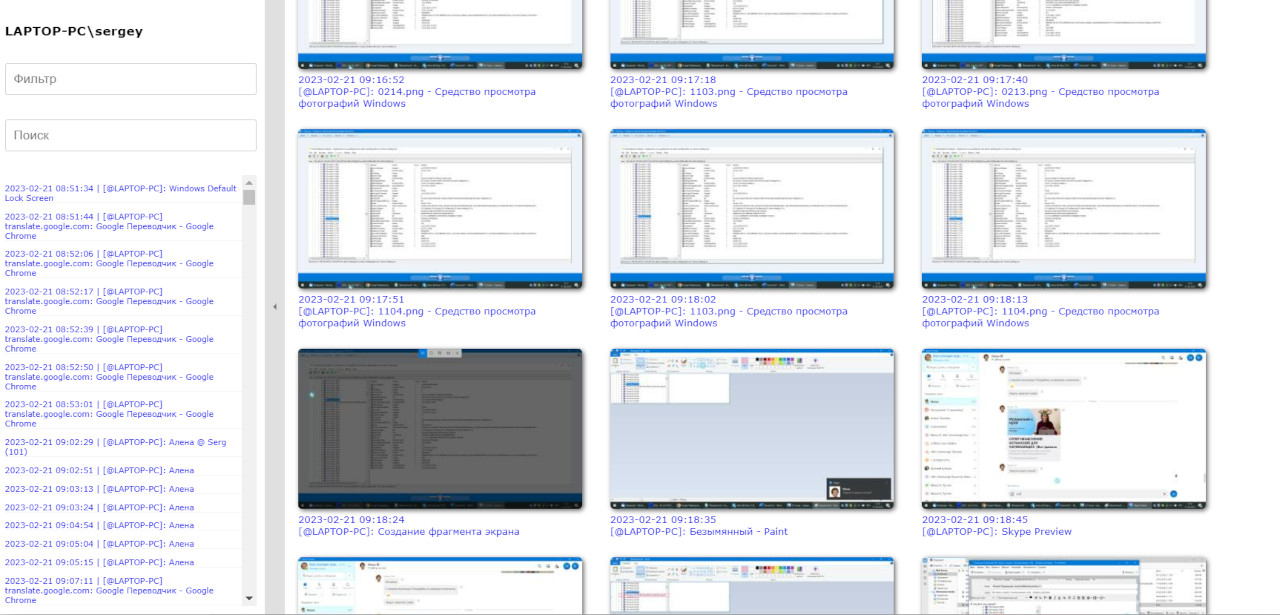 Снимки экрановОтчёт демонстрирует снимки экранов по выбранному пользователю, за указанный период. Обработка результатов возможна только для одного пользователя.