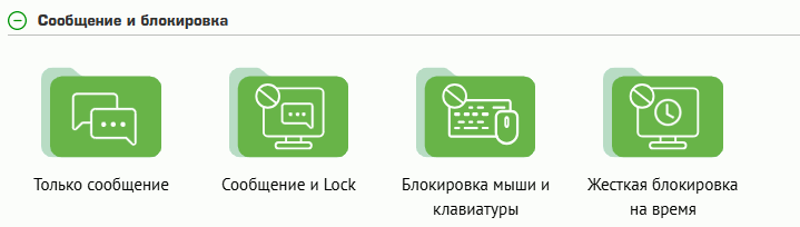 Сообщение и блокировкаЗдесь доступны следующие функции:![]() "Только сообщение" - отправка сообщения в виде Message Box пользователю; "Сообщение и Lock" - отправка сообщения на заблокированном экране (аналог нажатия Win+L); "Блокировка мыши и клавиатуры" - выдача сообщения пользователю (о блокировке администратором) и временная блокировка его клавиатуры/мыши (разблокировать можно нажав CTRL+ALT+DEL); "Жесткая блокировка на время" - экран пользователя блокируется на определенное время в минутах, или же разблокируется (в зависимости от введенного значения). Возможно для группы пользователей. |