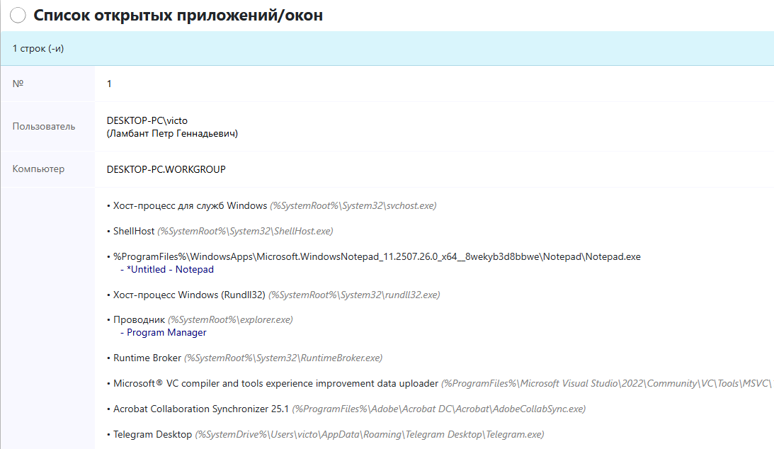Отражаются запущенные процессы и открытые окна пользователей. Красным цветом подсвечен активный, на момент нажатия кнопки, процесс. Возможно для группы пользователей.