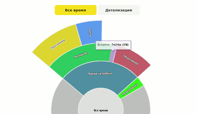 СводныйПолезен для оценки суммарной временной активности пользователя, недоработок, встреч, времени в программах, Интернете, а также детального просмотра использования каждого ресурса (программы/сайта) по времени.Перед построением отчета задаются параметры кол-ва рабочих часов и перерыва, а также период за который строится отчет. При расчете, за 100% берется сумма времени: рабочие часы + перерыв (перерывы можно исключить здесь) Внимание! Персональные графики работы имеют приоритет над опциями "Рабочие часы", "Начало дня", "Перерыв". Следует отметить, что отчет учитывает выходные дни, поэтому работа в выходной день считается переработкой! Построенные круговые диаграммы являются кликабельными, таким образом можно более дательно рассмотреть дочерние разделы или же перейти к отчету.