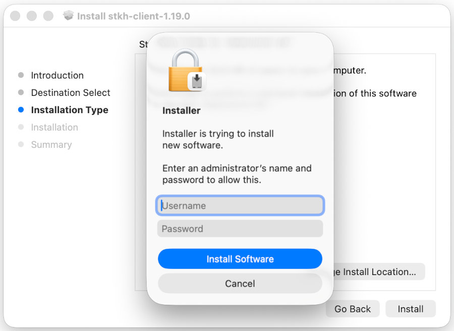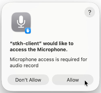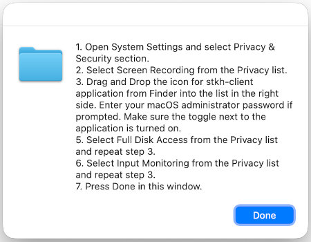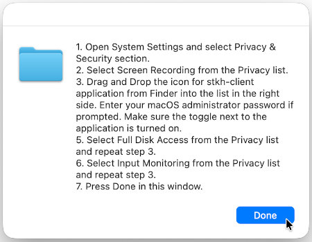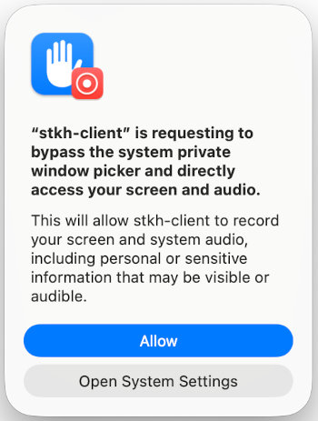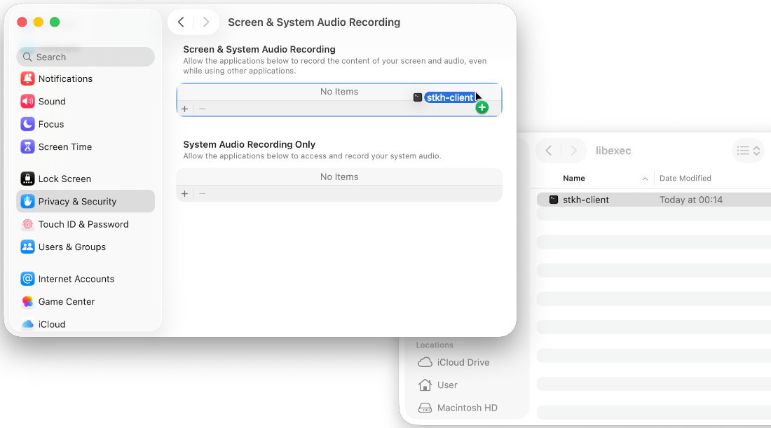 Далее в появившемся окне выбрать категорию "Privacy & Security → Screen & System Audio Recording" и перетащить файл "/usr/local/libexec/stkh-client" в список приложений: