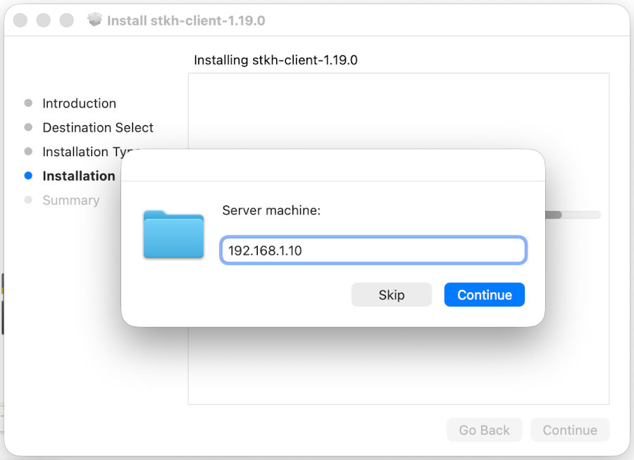 В ходе установки появится диалоговое окно для ввода адреса серверной машины:
