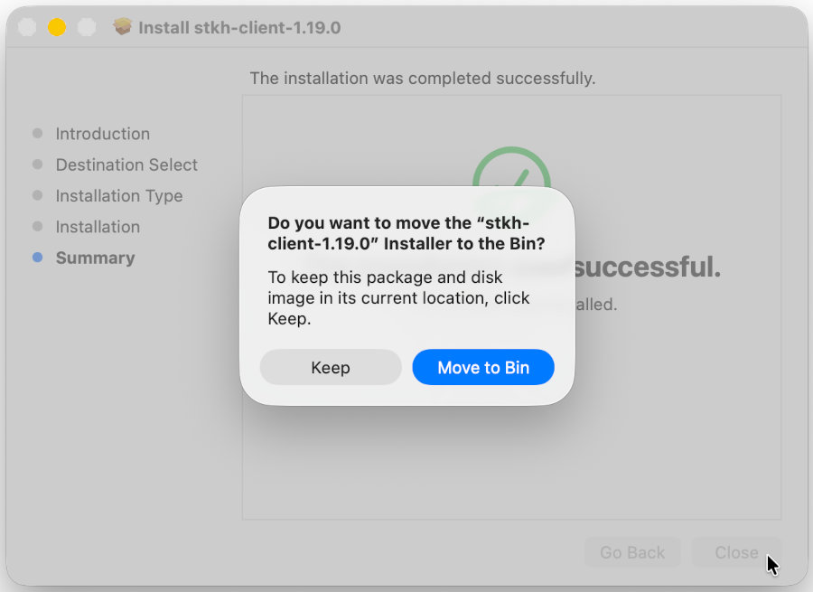 Установка завершена! Нажать "Close". Если пакет более не нужен, кликнуть "Move to Bin": |