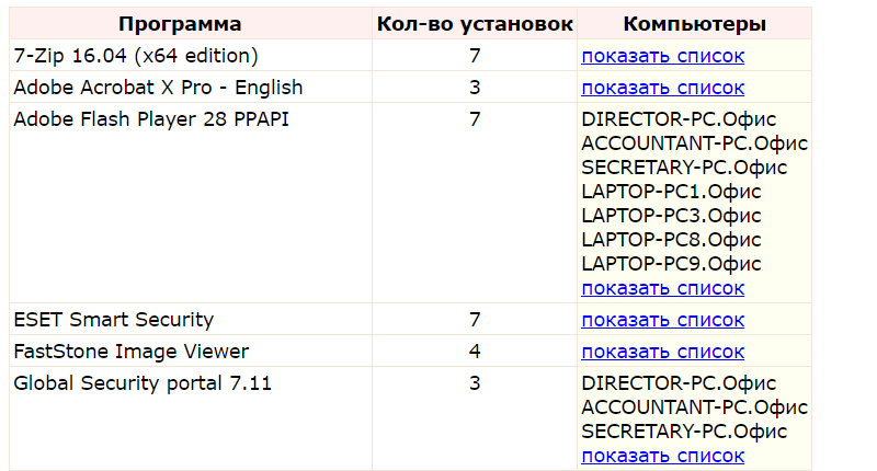 Установки программОтчет демонстрирует установленные программы и их количество на выбранных ПК.